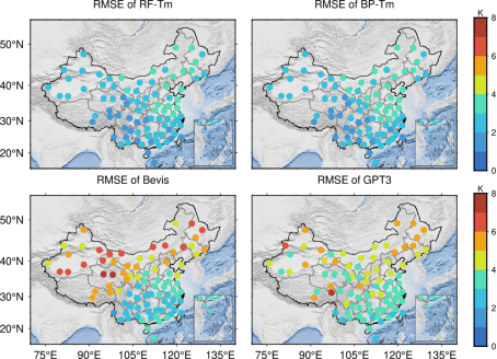 该论文针对GNSS水汽(PWV)反演中,大气加权平均温度(Tm)模型依赖实测气象参数且难以精确刻画其时空变化的问题,首次提出了融合盘古气象模型与随机森林算法的Tm实时预报方法,并构建了相应预报模型(RF-Tm)。该方法通过引入AI预报地表温度,并结合随机森林强大的非线性拟合能力,有效刻画了Tm在中国复杂地形下的时空变化特征。该模型在中国全域的验证结果表明,与传统的Bevis线性模型相比,均方根误差显著降低41.3%。与目前广泛使用的GPT3全球经验模型相比,精度提升达到了39.5%。相较于常用BP神经网络模型,新模型在精度与稳定性上仍有进一步提升,RMSE降低了2.8%。最终,该模型显著提升了GNSS反演可降水量的理论精度,使PWV反演的平均理论误差降至0.17mm,相对误差小于1%,尤其在青藏高原等传统模型表现较差的复杂地形区,改进效果最为明显,为实现高精度、无需气象观测依赖的实时GNSS水汽监测提供了可靠的数据支持。