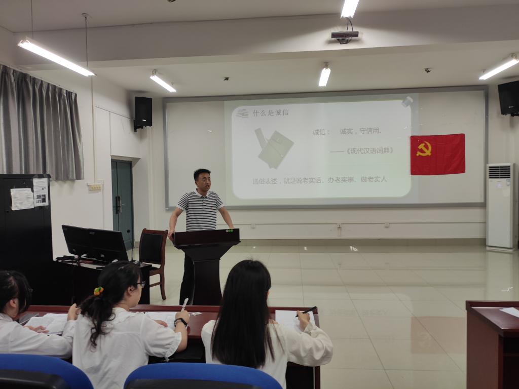 会上,支部书记郭统军老师通过什么是诚信展开讲述,从名人名言入手,讲解了什么是诚信,强调了诚信的重要性并向党员学生传达了“诚实守信廉洁”的做人理念并希望学生党员们能够将其转化为自己的思想和实际行动。