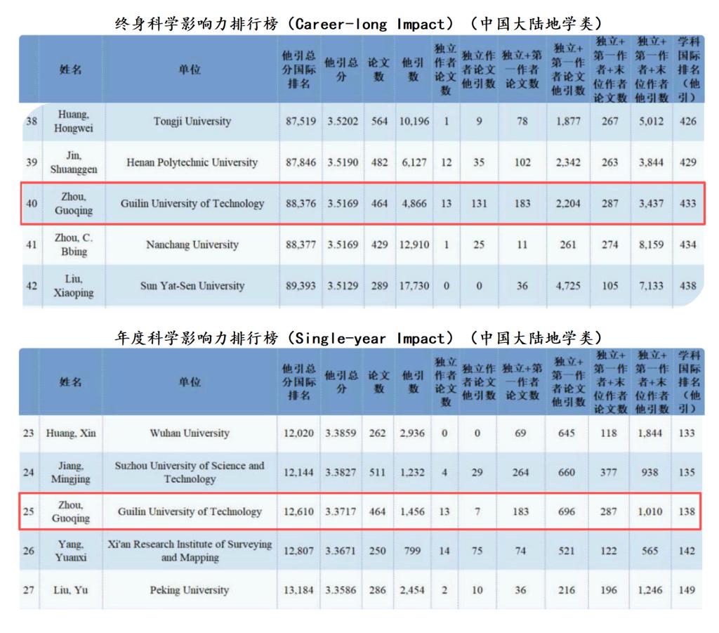 我院周国清教授第六次入选全球前2%顶尖科学家“终身科学影响力榜单”和“影响力年度榜单”。2025年,中国大陆地学类共226人入选“终身科学影响力榜单” 和523人入选“影响力年度榜单”,周国清教授分别位列第40名和25名,较去年排名提升38%、 56%,彰显了我院学术人才队伍建设和学科建设效能持续提升。